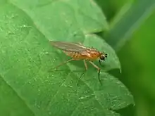 An adult Lonchoptera bifurcata is about 2-5mm (0.08-0.2in) long. In North America it can be distinguished from closely related species by having pale-coloured bristles behind the eyes, several bristles on the front of the tibiae of the first pair of legs (other species have a single bristle), and wings with fairly sharp points.[2] There are two colour phases, light tan and black. Dark phase individuals may have a completely dark abdomen or may have pale longitudinal markings on the abdomen.[3]
