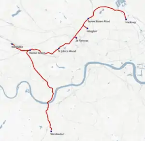 This phase linked Wimbledon and Hackney to substations at Willesden, St John's Wood, St Pancras, and Islington. It also involved the construction of two new substations at Seven Sisters Road in Highbury, and at Kensal Green, to feed traction power to Crossrail.[6][7]