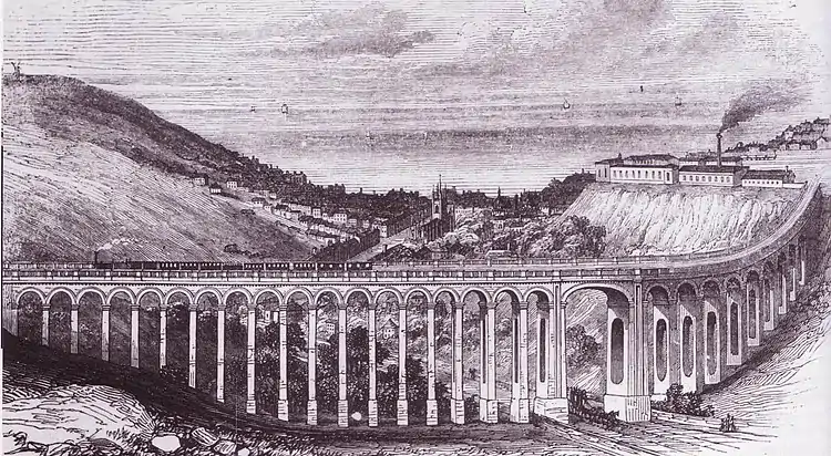 In the 1840s, the land northeast of Brighton station was undeveloped, consisting of fields.[2] It lay in a steep-sided valley running from north to south, created by the River Wellesbourne (by then, reduced to an intermittently flowing, mostly underground winterbourne).[5] Rastrick had to decide whether to cross this with an embankment or a viaduct. Local opinion favoured an embankment, and he faced opposition and criticism when he chose to build a viaduct.[6] Nevertheless, he planned a route for it, and laid the foundation stone on 29 May 1845. Construction took 10 months: the structure was ready on 28 March 1846,[2] more than two months before the line to Lewes opened. By the 1870s, dense terraced housing surrounded the viaduct: residential development was stimulated by the opening of the railway.[7][2]