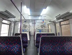 A distinctive feature was the use of transverse seating only, uncommon on the Underground. This is because it was designed for journeys which might last over an hour. Most of the seating was of the high-capacity transverse 3 + 2 arrangement.[8] Four tip-up seats were provided at the rear of the driving motor.[9] Despite each 8-car train seating 448 passengers,[10] the stock provided fewer seats than the locomotive-hauled and T stock trains that they replaced, but more seats than the S Stock which started to replace them on 31 July 2010. The stock had luggage racks and umbrella hooks, the only Underground stock to have these features, despite their presence on most contemporary British Rail stock. The A stock were the last subsurface trains built with headlights positioned on the left side of the cab giving them an asymmetrical appearance. They also had three tail lights positioned underneath the cab, although one was removed during refurbishment.