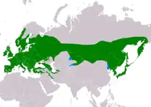 The long-tailed tit is globally widespread throughout temperate Northern Europe and the Palearctic, into boreal Scandinavia and south into the Mediterranean zone.[16] It inhabits deciduous and mixed woodland with a well-developed shrub layer, favouring edge habitats. It can also be found in scrub, heathland with scattered trees, bushes and hedges, in farmland and riverine woodland,[11] parks and gardens. The bird's year-round diet of insects and social foraging bias habitat choice in winter towards deciduous woodland, typically of oak, ash and locally sycamore species. For nesting, strong preference is shown towards scrub areas.[16] The nest is often built in thorny bushes less than 3 metres (10 feet) above the ground.[11]