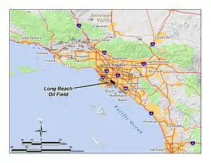 The Long Beach field is one of many in the Los Angeles Basin now largely overbuilt with dense urban development. Even with the dramatic land use changes over the decades since its discovery, it remains moderately productive, with oil wells and oilfield infrastructure intermixed with commercial and residential development. The field underlies the northern portion of the city of Long Beach and most of the city of Signal Hill. In spite of its name, most of the productive area of the field underlies the small city of Signal Hill, which has a population of around 11,000. The main productive area of the field runs from northwest to southeast, about five miles (8 km) long by one across, with the long axis following the Cherry Hill Fault Zone, which is part of the larger Newport–Inglewood Fault Zone, the most significant fault zone traversing the Los Angeles Basin.[7] In the northwest, the oil field begins approximately near the junction of the San Diego Freeway (I-405) and the 710 (the Long Beach Freeway), and proceeds roughly paralleling the 405 freeway to near the intersection of Lakewood Boulevard and California State Route 1 (the Pacific Coast Highway) at their traffic circle in Long Beach. A small portion of the field, no longer productive, is in the city of Lakewood, and another small isolated part of the field, the "Recreation Park Area", lies to the southeast of the main field. The total productive area of the entire field is 1,725 acres (6.98 km2).[8]
