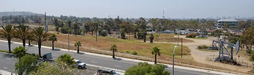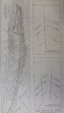 The Long Beach Oil Field is a large oil field underneath the cities of Long Beach and Signal Hill, California, in the United States. Discovered in 1921, the field was enormously productive in the 1920s, with hundreds of oil derricks covering Signal Hill and adjacent parts of Long Beach; largely due to the huge output of this field, the Los Angeles Basin produced one-fifth of the nation's oil supply during the early 1920s. In 1923 alone the field produced over 68 million barrels of oil, and in barrels produced by surface area, the field was the world's richest.[1][2][3] The field is eighth-largest by cumulative production in California, and although now largely depleted, still officially retains around 5 million barrels of recoverable oil out of its original 950 million. 294 wells remained in operation as of the beginning of 2008, and in 2008 the field reported production of over 1.5 million barrels of oil.[4] The field is currently run entirely by small independent oil companies, with the largest operator in 2009 being Signal Hill Petroleum, Inc.[5][6]