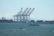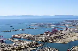 The Port of Long Beach, administered as the Harbor Department of the City of Long Beach, is a container port in the United States, which adjoins Port of Los Angeles.[3] Acting as a major gateway for US–Asian trade, the port occupies 3,200 acres (13 km2) of land with 25 miles (40 km) of waterfront in the city of Long Beach, California. The Port of Long Beach is located less than two miles (3 km) southwest of Downtown Long Beach and approximately 25 miles (40 km) south of Downtown Los Angeles. The seaport generates approximately US$100 billion per year in trade and employs more than 316,000 people in Southern California.[4] In 2022, the port, together with the adjoining Port of Los Angeles, were considered amongst the world's least efficient ports by the World Bank and IHS Markit citing union protectionism and a lack of automation.[5][6]