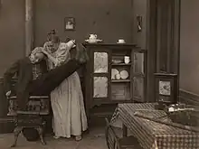 It may help the student of the real technique to study the climax of Long May it Wave, a Lubin comedy scheduled for release June 20th. This is a rather good example of the double climax. A man takes his wife to see a play in which the American Flag waved overtime, as used to happen in the palmy days of melodrama. The climax of each act is salvation through the flag. A few nights later he comes home late with two flags, and defies his wife. This is the natural and expected climax. It is funny but it is not startling, for several scenes back you saw him pick up the flags. You knew then how it was going to end. A moment later the wife offers him a drink, apparently to celebrate the victory. He lays down the flags for a glass. She grabs him. No one expected that. It will get more laughs after the laughs would seem to have been exhausted, but it should be borne in mind that this second kick must come like a flash to have any real value. It must not be something requiring elaborate explanation. It must seemingly be unpremeditated and must come as a total surprise.[4]