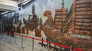 ![]() A mural on the mezzanine level of the station depicting Zheng He's voyages, which started along the Yangtze River near the station. | |||||||||||