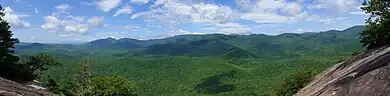 From the top of Looking Glass Rock, panoramic views can be seen of the Blue Ridge Parkway and surrounding mountains of Transylvania County.