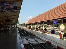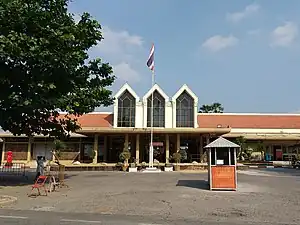 Lopburi railway station is a class 1 railway station in the centre of Lopburi, Thailand, located 133 km (83 mi) away from Bangkok Station. It is a terminus for commuter train services on the Northern Line.[1] Two large golden monkey sculptures are located on the platforms as the monkey is the symbol of Lopburi. The opposite side of the station building is an important archaeological site of Lopburi, Wat Phra Sri Rattana Mahathat.[2]