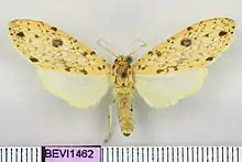 Ochreous; palpi with black spot at sides of 2nd joint; vertex of head, tegulae, patagia, tibiae, and tarsi with black spots. Fore wing irrorated with groups of black scales, some of them forming traces of oblique postmedial and subterminal dentate lines; some small black spots below base of cell; an antemedial spot on costa with a spot just beyond it in the cell and one on inner margin; a medial spot on inner margin and a larger discoidal spot; a small spot beyond the cell above vein 5, and a larger subterminal spot; a terminal series of small spots with larger spot below vein 2. Hind wing yellowish white. Hab. Brazil, Rio Janeiro, 1 m, 1 f type, Rio Grande; Bolivia, Suape; Peru, Hillap. Exp., M 42, F 50 millim.[2]