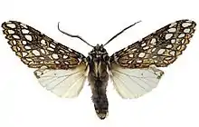 The forewings are brown, irrorated with pale or deep brown. One whitish spot with one yellow and two small black dots are found at the base. There is also a series of bands formed by whitish spots and organized as follows: a broken antemedial band, a slightly curved medial band, and a sinuous postmedial band. The hindwings are whitish and slightly tinged with grey on the apex and along the costa. The ventral pattern is more contrasting, deep brown centered with yellowish-brown.[2]