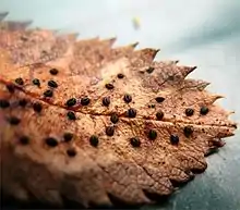 Lophodermium is a genus of fungi within the family Rhytismataceae.[1] The genus contains 145 species and has a global distribution.[2] Species of this genus are usually observed producing zone lines, conidiomata and ascomata on dead fallen leaves, but at least some are known to colonize living leaves. In many cases they then live inside the colonized leaf as a symptomless endobiont, where they are regarded as detritivores utilising dead plant matter. In a few cases they may kill all or part of the leaf prematurely, and there is a substantial literature dealing with those species as plant pathogens.[3] The genus infects many different plant families but with a notable concentration in the family Pinaceae; many Lophodermium species are restricted to a single host genus (or even species[4]), but some, particularly those infecting grasses, may infect several genera.[5][6] Some are economically important plant pathogens, such as those that cause needlecast disease in European Black Pine, Scots Pine and Red Pine in forestry and christmas tree plantations. In these species, notably L. pinastri and L. seditiosum, the fungal spores disperse and infect the pine needles in late summer, which turn brown by the following spring and then fall off.[3]