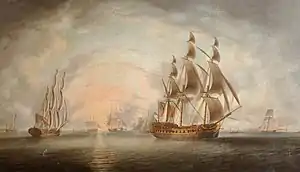 EIC voyage #5 (1794–1795): War with France had broken out in 1793 and Captain Hays acquired a letter of marque on 22 February 1794.[3] Lord Hawkesbury was one of 39 Indiamen that the British government held back for a planned attack on Mauritius, later canceled. (The Government would pay £1,292 for 62 days' demurrage, including 22 days at Spithead.[7])