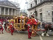 In 1711 an untoward accident befell the show, the mayor Sir Gilbert Heathcote (the original of Addison's Sir Andrew Freeport) being thrown by his horse. Sir Gilbert Heathcote broke his leg. The next year a coach was, in consequence, provided for the chief magistrate. In 1757 this was superseded by a gilded and elaborately decorated equipage costing £1,065 which was used until 1896, when a replica of it was built to replace it.