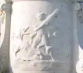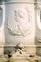 The figure symbolizing poetry is the only one of the three figures that faces the relief of Heine. It also faces towards a rose, which is supposed to express a particularly intimate relationship between poetry and Heine.[5] From the right of the Heine-relief is the figure of satire, which turns her upper body towards Heine.[6] In the back of the monument is positioned the "melancholy". The hair of the figure is long and unadorned, and she looks down sadly.[7]