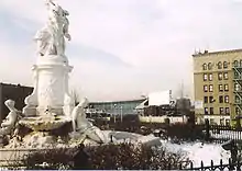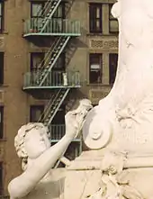 The monument was, from the start, the subject of frequent abuse and vandalism; although the monument was guarded by police, in 1900, the mermaids' arms were cut off.[14] Women of the Christian Association of Abstinence described the monument as "indecent" in a court case in February 1900;[21] other sources considered the monument as a "pornographic spectacle".[22] In 1940, the fountain was moved to the northern end of the park and partially repaired [23] In the following decades, the vandalism subsided, but later, the heads of the female characters were cut off again, the monument sprayed all over with graffiti. In the 1970s, the fountain was considered the statue in New York most affected by vandalism and destruction.