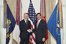 In August 2019 tensions grew within the populist government, leading to the issuing of a motion of no-confidence on Prime Minister Giuseppe Conte by the League.[11] After Conte's resignation, the national board of the PD officially opened to the possibility of forming a new cabinet in a coalition with the M5S,[12] based on pro-Europeanism, green economy, sustainable development, fight against economic inequality and a new immigration policy.[13] The party also accepted that Conte may continue at the head of a new government,[14] and on 29 August President Sergio Mattarella formally invested Conte to do so.[15] On 5 September, Guerini was appointed new Minister of Defence.[16]