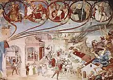 His next works are mostly wall paintings: in 1524 he painted a series of frescoes with the lives of saints (such as Saint Barbara) in the Suardi Chapel in Trescore (near Bergamo). In the details he depicts scenes of each saint's life, such as in the fresco Martyrdom of St. Claire. In the same fresco he portrays Christ with vines sprouting from his hands, illustrating the words of the New Testament: "I am the vine, you are the branches".[3] In 1524 he also painted cartoons with Old Testament stories, as models for the intarsia panels for the choir stalls of Santa Maria Maggiore in Bergamo.