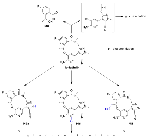 Lorlatinib is inactivated by oxidation, mainly through CYP3A4, and by glucuronidation, mainly through UGT1A4. Other CYPs and UGTs play a minor role. Lorlatinib and its metabolites are excreted with a half-life of 23.6 hours after a single dose; 47.7% into the urine (of which less than 1% in unchanged form), and 40.9% into the faeces (9.1% unchanged).[7]