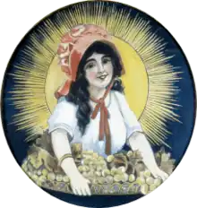 The company later commissioned a watercolor portrait of Collett from San Francisco artist Fanny Scafford to use as the basis for the "Sun Maid" corporate mascot devised by advertising executive E.A. Berg.[3] Her likeness was trademarked and began appearing on raisin packaging in 1916. Use of Collett's image was so successful in promoting its products that by 1920 the company adopted "Sun-Maid Raisin Growers' Association" as its new name. Backed by an aggressive marketing push throughout the 20s, Sun-Maid managed to triple American consumption of raisins by the end of the decade.[4] A revised version of her likeness continued to be featured on all Sun-Maid packaging through 1960. In 1974, Collett was presented with a commemorative plaque by Sun-Maid's president at a ceremony where she presented Scafford's original portrait and the red bonnet to the company in exchange for $1700. Sun-Maid executives donated Collett's bonnet to the Smithsonian Institution in 1987 on the occasion of the company's 75th anniversary.[5]