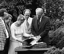 Monk's photo book, Between Friends / Entre Amis (1976), was designed as Canada's gift to the United States for the United States Bicentennial in 1976.[1] Monk accompanied then Canadian Prime Minister Pierre Trudeau to hand over the gift to then US President Gerald Ford in a ceremony in Washington, D.C.[7] The 262-page photo book documented the life, scenes, and people, from both sides of the shared border between the two countries.[8] Anna Porter, editor-in-chief at McClelland & Stewart, the publishing house that published much of Monk's works, complimented her on her judgement, and went on to say that Between Friends / Entre Amis (1976), "became the gift book of the decade".[1]