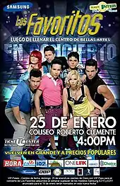 "Los Favoritos" is a young Puerto Rican pop group formed in 2008. This pop group includes eight former participants from the competition "Objetivo Fama", namely: Arquímides, Blanca Rosa, Ediberto, Javier, Jometh, Jonathan, Luz Maria, Mary Ann Acevedo, and an accomplice Francisco Zamora.[1] Two members, Javier Baerga Schroeder and Luz Maria, later left the group to record solo albums.