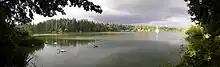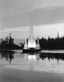 The next controversy surrounding the lake followed the proposal for a fountain to be erected in the lake to coincide with the city's Golden Jubilee anniversary celebrations in 1936. For the mayor, it would be "a miracle of engineering," with the spray of water lit by virtually "limitless combinations" of colour.[9] The public, in contrast, were not impressed by the proposal. Its $33,019.96 price tag was considered extremely frivolous in the midst of an economic crisis. As written in The Sunday Sun Edition of the Vancouver Sun Newspaper, Saturday, August 8. 1936. The lead story in the Magazine section is; SECRETS OF THE FOUNTAIN. It was the conception and idea of then, Chief Electrical Engineer, Robert Harold Williams with Hume and Rumble Ltd. electrical contractors. R.Harold Williams designed and supervised the erection of the Vancouver's Golden Jubilee fountain. After a business trip to Los Angeles he saw a fountain and thought this would be a great gift for the city for their up and coming birthday, Golden Jubilee celebration. To build the fountain, Lost Lagoon was drained. Seventy piles were driven into the mud. On these a concrete mat was laid. The fountain was built upon this mat. The work was of necessity rushed; it was done in a month. "The fountain is worthy of all the traditions of art, worthy of Vancouver's Golden Jubilee, and it will be a permanent, decorative joy in Stanley Park". "When operating , it is like a symphony concert, in motion and color instead of music, says Harold Williams, engineer, of Hume & Rumble Ltd., under whose personal supervision the work has been done." Vancouver's Jubilee Committee and private citizens who contributed are to be commended on their work in pushing for this beautiful fountain, which is sure to be one of the major attractions during the Golden Jubilee celebration. "We've had to hurry," says Mr. Williams," in that time 285 tons of cement have been utilized and all the special equipment was built." All equipment was built in Canada and the pumps were constructed in Vancouver. All union labor was employed.[10] It was restored for Expo in 1986.[11]