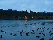 Lost Lagoon is an artificial, captive 16.6-hectare (41 acre) body of water, west of Georgia Street, near the entrance to Stanley Park in Vancouver, British Columbia, Canada. Surrounding the lake is a 1.75 km (1.09 mi) trail. The lake features a lit fountain that was erected by Robert Harold Williams to commemorate the city's golden jubilee. It is a nesting ground to many species of birds, including non-native mute swan (whose wing tendons have been clipped to prevent escaping[1]), Canada geese, numerous species of ducks, such as mallard ducks, and great blue herons. Also many turtles are usually resident on the northern shore.