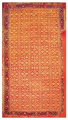 Lotto carpets used to be known as "Small-pattern Holbein Type II" by Western scholars, but Holbein never painted one, unlike Lorenzo Lotto who did so several times (although he was not the first artist to do so). Lotto is also documented as owning a large carpet, though its pattern is unknown. Though they look very different from Holbein Type I carpets, they are a development of the type, where the edges of the motifs take off in rigid arabesques somewhat suggesting foliage, and terminating in branched palmettes. The type was common and long-lasting, and is also known as "Arabesque Ushak".[1][2][3] Lotto carpets are also depicted in paintings by Murillo, Willem Key and Zurbarán in the 17th century, and Dutch paintings until the 1660s and sometimes later.[4]