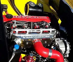 As early as 1964, Lotus recognized the need to find a replacement for the Lotus Twin Cam engine.[2] Colin Chapman issued a brief that listed the features to be required in a new engine, including 'high efficiency, flexibility, torque and smoothness which was suitable for hand assembly'.[3] Unable to find this combination in any existing engine, the company used outside consultants and internal resources to define the characteristics of the next Lotus engine.[4] After having rejected a 120° V6 due to being too wide for Lotus' chassis and a 60° V6 as too tall for the intended bodywork, the engineers determined that a 2-litre inline-four engine was the optimal choice. This future engine would have four valves per cylinder (16 valves total) operated by belt-driven dual overhead cams and develop 150 hp (112 kW). The block would be angled at 45° from vertical to permit a lower bonnet and simplify development of a 4-litre V8 version for future use in Indianapolis racing.