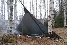 A loue is an ultra-light Finnish open tent-like shelter. It is used to give reasonable protection from wind and rain during a variety of outdoor activities, including camping, canoeing, hiking and hunting.[1] Loues are popular with Scout groups and minimalist campers. Suitable as one or two person shelters, they are compact, light (2.2 lbs or 1 kg) and can be set up and taken down in a basic way fairly quickly. The workman-like sets shown in photographs indicate that more effort can be made to stiffen the sides and the stakes and lines used can complicate a taut setup. The open front permits fire viewing, ventilation and looking out over a scenic view. A loue consists of a roughly conical section of fabric with the semi-circular bottom edge grounded by stakes and the tip raised with a single pole. Suitable standing tree trunks may be used to suspend the tent if an open campfire is not to be used. This style of ''tarp tent" can best be raised using a scissors-pole assembly.[2] A pole suspension system allows for positioning an open fire in front of the shelter without the risk of damaging tree trunks or roots. The panels of a true Finnish loue are designed to provide a semi-circular short wall around the shelter and a triangular piece at the tip can be let down to provide a little more shelter in front. With suitable siting and careful staking and tensioning, the side walls can be set close to the ground, providing protection from drafts and lifting from winds.