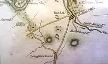 Loughbrickland was a major seat of the Magennises of Iveagh. The Magennis castle was believed to be on the shores of Loughbrickland Lake, although they also inhabited the crannog on the lake as late as the seventeenth century. The Magennises were succeeded in the Loughbrickland area by Sir Marmaduke Whitechurch.[6] Probably the most prominent developer of the district, Whitechurch established villages, churches, and markets that formed the basis of the local infrastructure. Sir Marmaduke built his castle by the lake,[7] which was subsequently dismantled by Cromwell's army. The castle remained in ruins until 1812, when they were removed and a dwelling-house was erected on its site. Its exact location has never been accurately identified; possible sites range from the site of the Magennis castle to where the old Aghaderg School now stands to where the Church of Ireland built their rectory in 1801.