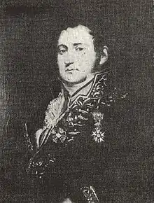 In the spring of 1827 Raymond Durand visited Sankt Petersburg and on 20 June 1827 arrived in Warsaw.[3] To organise a proper embassy, he soon rented a small house at Warsaw's Nowy Świat Street 34, consisting of eight rooms on two stories, a kitchen, two rooms for servants and a garage for two carriages.[3] On 29 July he visited Grand Duke Constantine Pavlovich of Russia and was accepted as a new consul.[3] During his stay in Poland he befriended many notable people of his epoch, among them Prince Adam Czartoryski, Nicolas Chopin, Philippe Girard and generals Piotr Bontemps and Jan Chrzciciel Mallet.[4]
