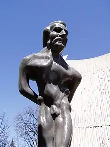 Two statues of Riel are located in Winnipeg. One of these statues, the work of architect Étienne Gaboury and sculptor Marcien Lemay, depicts Riel as a naked and tortured figure. It was unveiled in 1971 and stood in the grounds of the Manitoba Legislative Building for 23 years. After much outcry (especially from the Métis community) that the statue was an undignified misrepresentation, the statue was removed and placed at the Université de Saint-Boniface.[104][105] It was replaced with a statue of Louis Riel designed by Miguel Joyal depicting Riel as a dignified statesman. The unveiling ceremony was on 12 May 1996, in Winnipeg.[106][105] A statue of Riel on the grounds of the Saskatchewan Legislative Building in Regina was installed and later removed for similar reasons.[107]