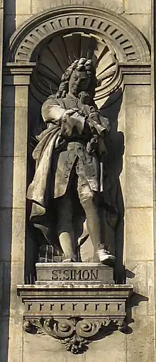 Louis de Rouvroy, duc de Saint-Simon, GE (French pronunciation: [lwi ʁuvʁwa]; 16 January 1675  2 March 1755), was a French soldier, diplomat, and memoirist.[1] He was born in Paris at the Hôtel Selvois, 6 rue Taranne (demolished in 1876 to make way for the Boulevard Saint-Germain). The family's ducal peerage (duché-pairie), granted in 1635 to his father Claude de Rouvroy (1608–1693), served as both perspective and theme in Saint-Simon's life and writings. He was the second and last Duke of Saint-Simon.