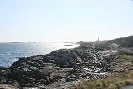 The first part of the trail is suitable for visitors of all skill levels.[2] It begins at the parking area at Lighthouse Point and follows the ocean coast to the east as a 2 kilometres (1 mi) hard-packed gravel partial loop trail. Along this part of the trail are a number of interpretive panels explaining the area's historical significance and natural features including its geography, flora and fauna.[2] There are benches to rest along the trail, as well as lookoffs in strategic places. Sections of the trail, where it passes over a fen and other wet ground are constructed as an elevated wooden boardwalk.[3] The trail is accessible to power wheelchairs and children in strollers and wide enough for two to walk abreast.[4][5] Pets are permitted on the trail but must be leashed and managed by their owners.[6] There are a number of small side paths branching off along this part of the trail, such as the one that gives access to the top of Lighthouse Cliff for an expansive view.[3] The trail follows the coast past Lighthouse Cove, Crows Roost, Morningstar Cove and continues to Western Gun Landing Cove Head where it loops back around toward the start.