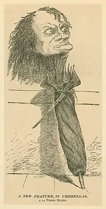 In March 1883 Michel and Émile Pouget led a demonstration of unemployed workers. In a subsequent riot, 500 demonstrators led by Michel pillaged three bakeries and shouted "Bread, work, or lead".[2] Reputedly, Michel led this demonstration with a black flag, which has since become a symbol of anarchism. It was the first recorded use of the anarchist black flag.[2]