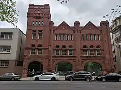 Made of red sandstone and bricks, it was designed in a Richardsonian Romanesque design. The building has a five-story drying tower that originally supported an additional two-story belfry tower. The belfry tower was used as a lookout to survey the surrounding area for signs of fire and housed a fire warning bell. The belfry tower was later removed from the building. The facade of the building features relief sculptures of Benjamin Bache, the fire chief at the time, and Emile Bourlier, who was a bookkeeper for the sinking fund. Three large arches located at the base of the structure once served doorways for the horse-drawn fire engines housed in the building; the second floor was originally used as offices and sleeping quarters for the firemen.[1]