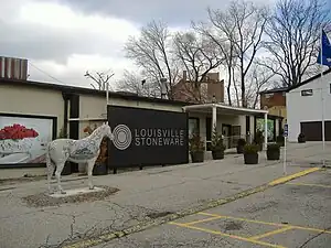 Louisville Stoneware, previously known as Louisville Pottery, is located in the Highlands section of Louisville, Kentucky. Founded in 1815, making it one of the oldest stoneware companies in the United States, it creates fanciful stoneware that is nationally renowned.[1][2][3] It specializes in decorating its pottery with Kentucky Derby and Christmas themes, but it has other themes as well: Noah's Ark, Primrose, and Pear being examples. They can also create personalized items. Besides pottery, they have made bird baths and bird feeders.[3]