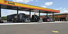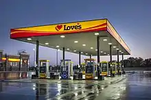 Love's Travel Stops & Country Stores, doing business as Love's (or stylized as Loves), is an American family-owned and -operated chain of more than 630 truck stops in 42 states in the United States. The company is privately owned and headquartered in Oklahoma City. Love's ranked No. 10 on the 2022 Forbes list of America's largest private companies.[1] Love's has two primary kinds of stores: country stores and travel stops. Country stores are fueling stations with a convenience store attached. The larger travel stops are located along highways and offer additional amenities such as food from restaurant chains such as Arby's, Bojangles, Burger King, Chester's, Dunkin', McDonald's, Taco John's, Subway, Wendy's, Hardee’s/Carls Jr., truck parking spaces, showers and laundry. The company started adding RV hookups and RV Stops in 2022. Love's had more than 40,000 employees in 2023.[2]