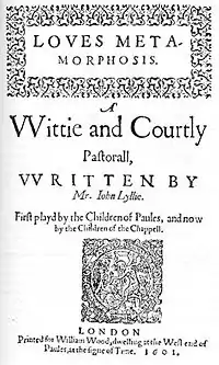 Love's Metamorphosis was entered into the Stationers' Register on 25 November 1600, and was first published in 1601 in a quarto issued by the bookseller William Wood. The title page of the 1601 quarto calls the play a "witty and courtly pastoral," and states that it was first staged by the Children of Paul's, the troupe of child actors that was Lyly's regular company, and "now" (c. 1600) by the Children of the Chapel. "Probably the Paul's boys produced it c. 1589–90, and the Chapel revived it in 1600–1."[1]