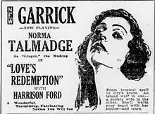Love's Redemption is a 1921 American silent adventure drama film directed by Albert Parker and starring Norma Talmadge, Harrison Ford, and Montagu Love. The film is presumed to be lost.[1]