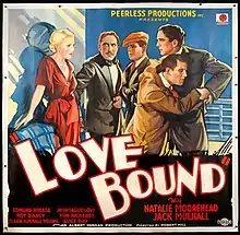 Love Bound is a 1932 American Pre-Code mystery film directed by Robert F. Hill and starring Jack Mulhall, Natalie Moorhead, Clara Kimball Young.[1] It is a second feature produced by the Poverty Row studio Peerless Pictures. The film is also known as Murder on the High Seas, the alternative title it was later reissued under.