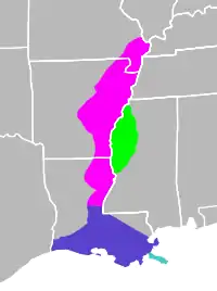The plain is divided into (a) the Mississippi River Delta in the southern half of Louisiana and (b) the upper Mississippi Embayment running from central Louisiana to Illinois.[2]