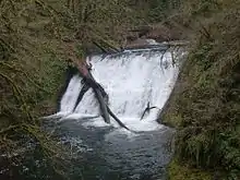 Lower North Falls is the last of six waterfalls created along the course of North Silver Creek and is the furthest from the Silver Falls State Park Trail of Ten Falls, along Canyon Trail, a quarter of a mile north of Drake Falls.[2] Double Falls forms a few yards upstream through Hullt Creek, a tributary of the North Fork Silver Creek.