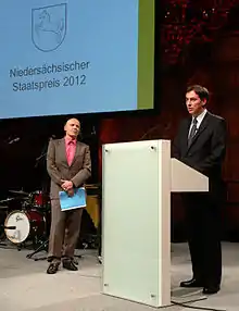 The Lower Saxony State Prize (German: Niedersächsischer Staatspreis) has been awarded by the State of Lower Saxony since 2002. From 1978 to 1999 it was called the Lower Saxony Prize (German: Niedersachsenpreis).[1] The award is presented by the Prime Minister of Lower Saxony.[2] The prize has been awarded to personalities who have made outstanding services to the state through their outstanding work in the fields of culture, women, social affairs, science, the environment or the economy.[1] The award is endowed with €35,000 and can be shared.[3] The award winners are selected by a voluntary jury consisting of up to ten people from Lower Saxony.[1]