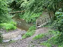 Confluence of streams and a bridge on the edge of Lower Woods Nature Reserve