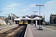 Dieselisation was gradually implemented in Suffolk from the 1950s onwards.[77][78] It began in 1954 when many steam engines were withdrawn from the Lowestoft area, followed in 1955 by the introduction of the two and four car diesel railcar units for the short services.[33] After June 1960, the East Suffolk line was only served by diesel trains.[62] The last recorded steam hauled passenger train left the station in June 1962, although for a number of years afterwards Class B1s were allocated to Lowestoft during the winter months to provide steam heating for hauled stock prior to departure behind diesel locomotives.[79][80][33] The next steam-hauled passenger train at the station was not until 4 May 2002 when BR Standard Class 4 2-6-0 No. 76079 headed 'The Easterling' from Liverpool Street via Norwich.[81] By the early 1960s, steam engines had almost disappeared from Lowestoft and in September 1962 the engine sheds and turntable finally closed.[80][82][83] Long distance through services were also cut down with the loss of the through trains to Birmingham and York in late 1964 on the basis that Lowestoft did not have sufficient facilities for the storage and cleaning of coaches.[33] The closure of the line between Lowestoft and Yarmouth South Town in 1970 saw the removal of the rails into platform 1. This section of the trackbed, as well as the siding which ran alongside, now forms part of the station car park.[84]