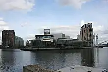 At the core of the complex are two theatres and a drama studio. The Lyric Theatre has 1,730 seats while the Quays has 466.[3] The theatres host touring plays, comedy and musical events and Opera North.[18] The Lyric Theatre has the largest stage in the United Kingdom outside London's West End.[5] It played host to the 2011 Royal Variety Performance.[19]