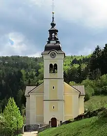 The local church is dedicated to Saint Vitus (Slovene: sveti Vid) and stands in the eastern part of the settlement in the middle of a cemetery. The original Late Gothic church was extended and a belfry was added in 1669. In 1898 the old church, apart from the belfry, was demolished to make way for an entirely new building.[5] The current church has a rectangular nave with side chapels and an octagonal presbytery walled on three sides. The church was designed by Anton Jeblinger in 1897 and the stonework was executed by Peter Bevk from 1898 to 1899.[6]