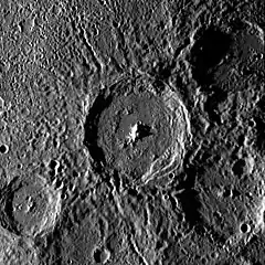 Oblique view of Lu Hsun crater (lower right), with bright hollows at the central peak